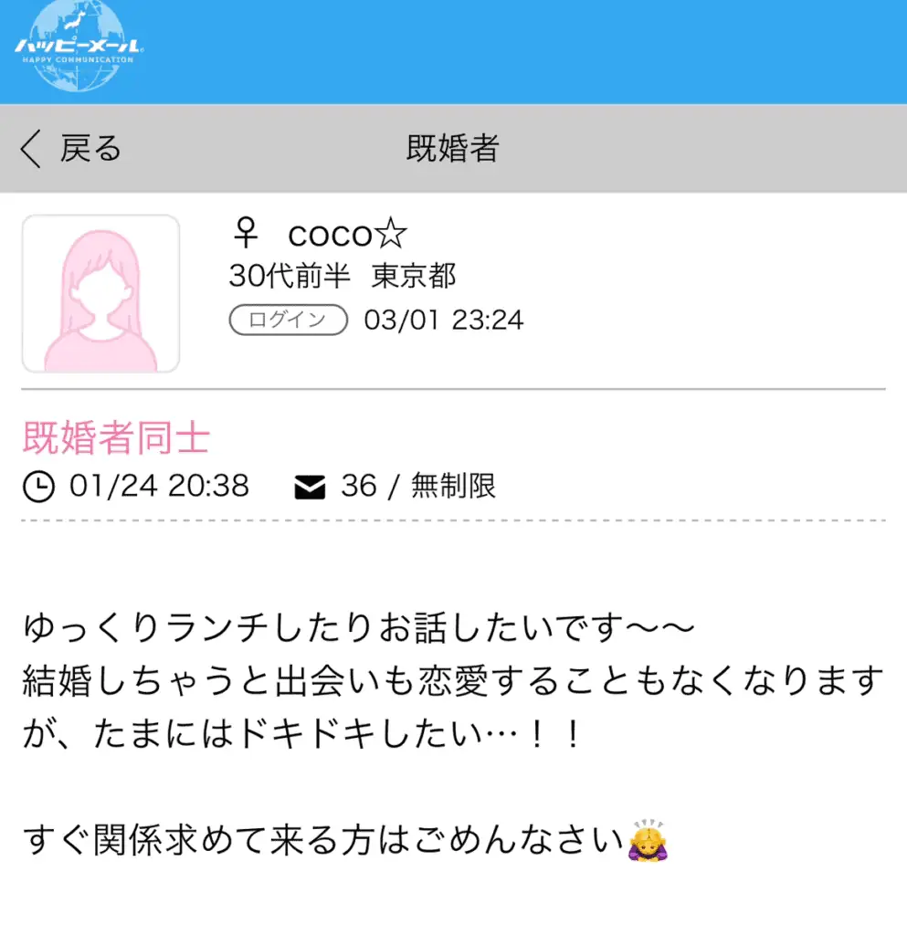 下記は大手の出会い系なので登録者も多く不倫系の掲示板もあるので人妻と出会いたいなら使ってみるのもよいでしょう。