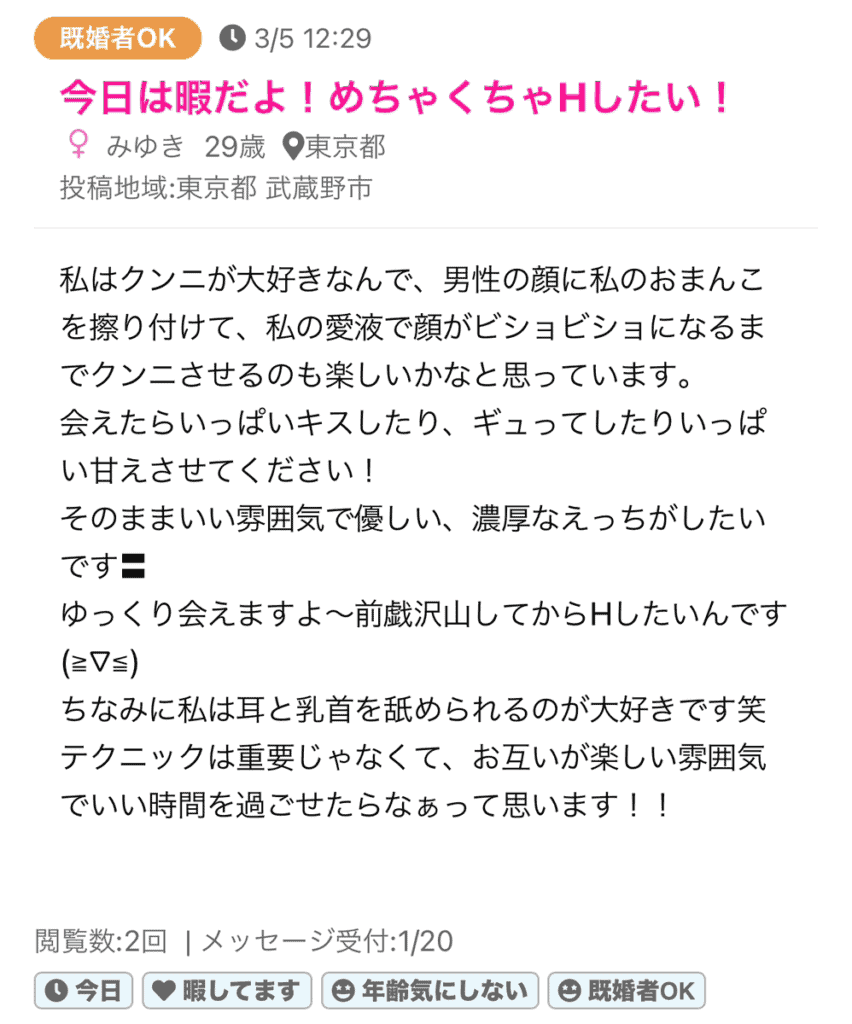 しかし、暇つぶしやワンナイト、セフレ募集が目的の場合は、割と簡単にアポが取れます。